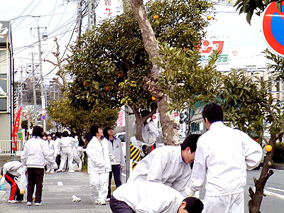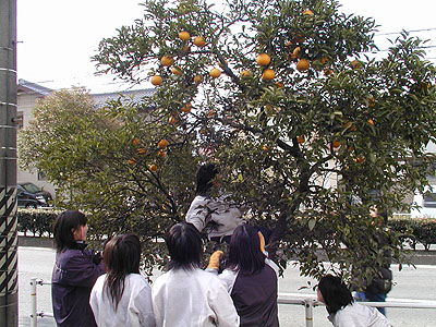 日本列島が寒波に包まれた1月31日(月)、愛知県豊橋市の青陵(せいりょう)街道の「夏みかん並木」で豊橋市立青陵中学生1,2年生400人の若い歓声がこだましました。豊橋の風物詩−夏みかんの収穫です。