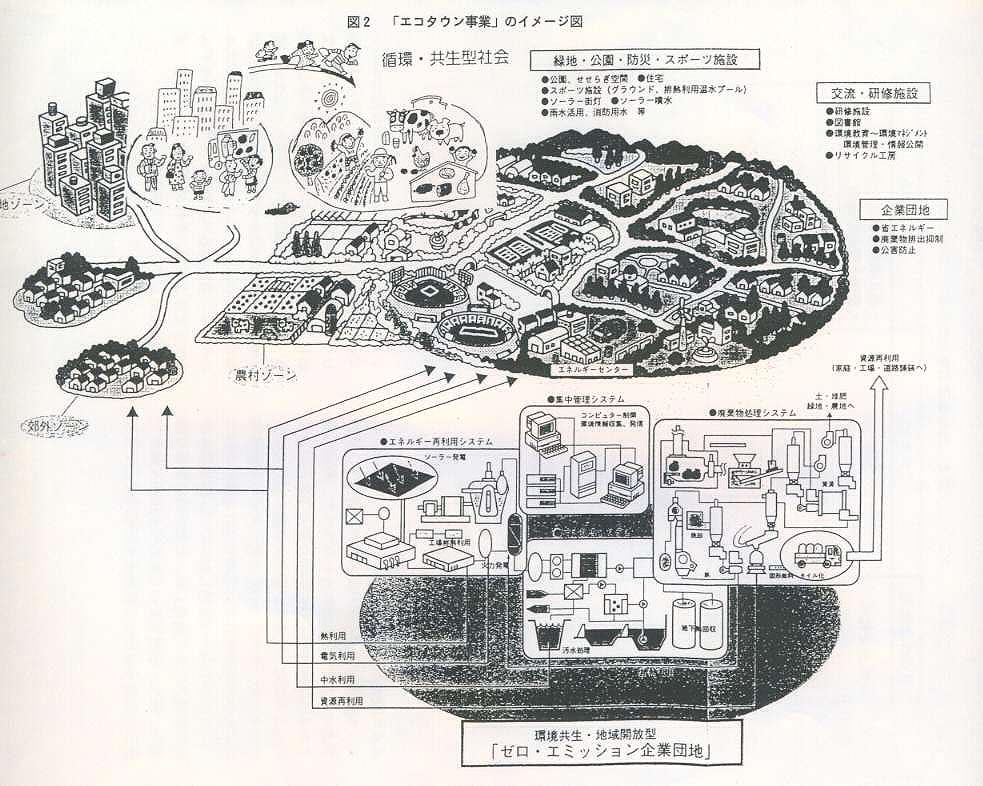 ・緑地・公園・防災・スポーツ施設・交流・研修施設・環境共生、地域開放型のゼロエミッション企業団地等を有機的に配置した省エネ、省資源、リサイクル型の都市(エコポリス)づくりです。