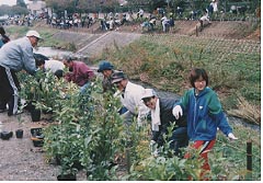 「朝倉川育水フォーラム」主催の「緑の回廊作り」に「朝倉川を守る会」も参加。全参加者1500人、植樹樹木は1万本。今回で3回目。