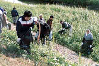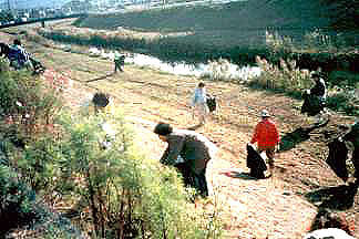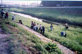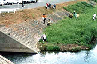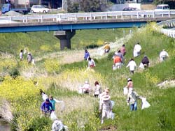 第6回「朝倉川530大会」。約1500人を超える市民が総延長8`の朝倉川のクリーンアップに心地よい汗を流した。「朝倉川を守る会」から22名参加。