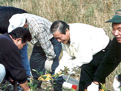 午前9時半から「朝倉川植樹大会」。「朝倉川を守る会」も16人が参加し、”ツツジ”を約150本植樹。いい汗をみんなでかいた。