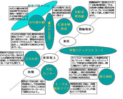 私たちのまち東田・旭の地域には「とよはし」の歴史のなごりや文化の香りが点在しています。これらの資源を際立たせながら、地域の特色を生かした新たな施設を配置する事により、私たちの街の魅力を満喫できる「旭・東田魅力通り」をつくります。それは例えばこんな感じです。