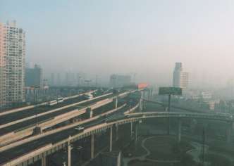 11月6日(木) 朝もやの中に中国の人々が動き出している。高速道路の車の群
