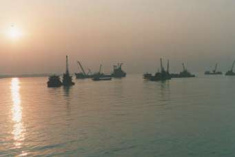 ー乗り場へ。幅11kmの揚子江は雄大である。夕陽に映える悠久の流れは果てしな