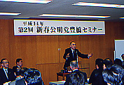 02年01月26日(土) 「新春公明党豊橋セミナー」で講演する草川党副代表。激動の内外情勢のなかで、東アジア経済圏の確立を訴えた。そのキーワードはワールドカップであることも。