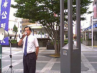 02年7月22日(月)豊橋駅前での街頭演説は6ヶ月目に入る。出口が見えない不況の中で生活者の政治を懸命に訴える。