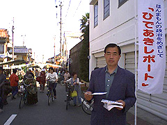 03年4月28日(月)朝市での「ひでレポ」配布は当選の次の日から再開した。控える衆参国政選挙の大勝利をめざして間断なき活動。