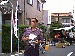 03年8月23日(土)「三八朝市」での「ひであきレポート」配布は炎天下で黙々と続いた。我が議員活動の原点。