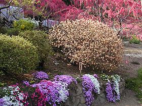 桃の花にみつまたと芝桜が映える。04/04