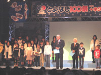 途中、午後2時からの「とよはし100祭 +ネクスト100」、100周年記念行事の閉幕記念式典に参加。「平和・交流・共生の都市宣言」も市内の小学生たちの朗読で高らかに。また記念映画「早咲きの花」表現コンクールの受賞者の紹介もあり、向山小学校3年の高木はるなさんの感想文が、本人から朗読されたが、戦争の時代を生きたおじいさんと、この映画を見ながらのほのぼのとしたやりとりが共感を呼んだ。