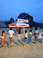 夕方から校区の「納涼盆踊り大会」。蒸し暑い中を多くのみなさんが集まり、「トントンとよはし」などを踊った。