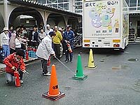 10時からは地域の三町内合同での防災訓練が小学校の体育館で。消防署からグラッド号もやってきて震度6を体験したり、三角巾での応急救護などみんな一生懸命。