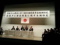 水没関係者はじめ設楽町、議会とそのOB、下流受益団体代表らおよそ300人が見守る中、豊川流域全体の一体的発展を願って、それぞれの代表が協定書に署名、押印した。昭和48年11月に計画申し入れ以降36年の歳月が流れ、貯水量9,800万d、総事業費3,000億円の巨大公共事業「設楽ダム」はいよいよ建設に踏み込む。
