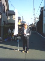 夕方は、祭りからの帰りの人出を考えて、電車通りで街頭演説。「不況の中で、公明党が推進した子育て応援特別手当が12月の支給目指して準備していましたが、凍結となりました。国の補正予算とは一体何でしょう。そして市議会の議決とは何でしょうか。報道によれば仙谷行政刷新大臣は『公明党がやろうとしたものだから止めればいい」と執行停止を求めたとのこと。こんな暴挙が許されていいのでしょうか!」と気合を入れて演説した。