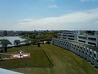 ●4月28日(水)雨続きの毎日にやっと初夏の陽が。病院から見える名古屋のまちは新緑に覆われてきた。ドクターヘリが羽根をやすめている。
