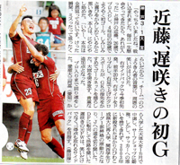 「やっちゃいましたね。吸い込まれました。毎日一生懸命やっできたから、あれが入った」と神戸の近藤。26歳でプロ入りし、4年目の29歳でようやく初ゴール。しみじみと菩びをかみしめているかと思いきや、本人は、にやにやし始めた。「いやー、本当は全然狙ってないです。けった瞬間、ミスったって思ったくらいだから」。チーム一のひょうきん者の言葉に、周囲の笑いがはじけた。 右サイドバックで今季初先発。前半20分、石サイドをドリブルし、右足で上げたクロスボールが、GKの指先をかすめてゴールネットを揺らした。大宮を突き放す、貴重な追加点となった。