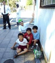 ●11月1日(月)午後2時半ころ、旧東海道の曲尺手町交差点付近を走っていたら、何やら変わった集団がやってきた。「なんだ、なんだ」とみたら、東海道五十三次走破に挑戦中の噂の「エボルタ」ではないか。交差点付近では子供たちに囲まれて、記念撮影のサービス。