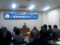「三遠南信サミット」は18回目、いつもこの時に「三遠南信議会議長会」も行われ、三遠南信道整備促進のための会合が行われるが、それには参加せずに「住民セッション」に参加した。