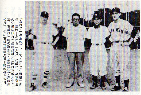 野球が好きだった義父は岐阜商業高校のグランドの近くで八百屋をやっていて、売り上げよりも、野球部への差し入れが多く、倒産してしまう。高山に優秀なキャッチーがいて養子縁組までして、岐阜商業高校へつれてきた。その息子−古田捕手が立教大学へ進み、杉浦投手とバッテリーをくむ。その時のキャップテンは長嶋さん。