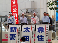 ●7月9日(火)夕方とはいえ、夏の陽が容赦なく降り注ぐ豊橋駅前に集まった大観衆を前に太田国土交通大臣が力説する。